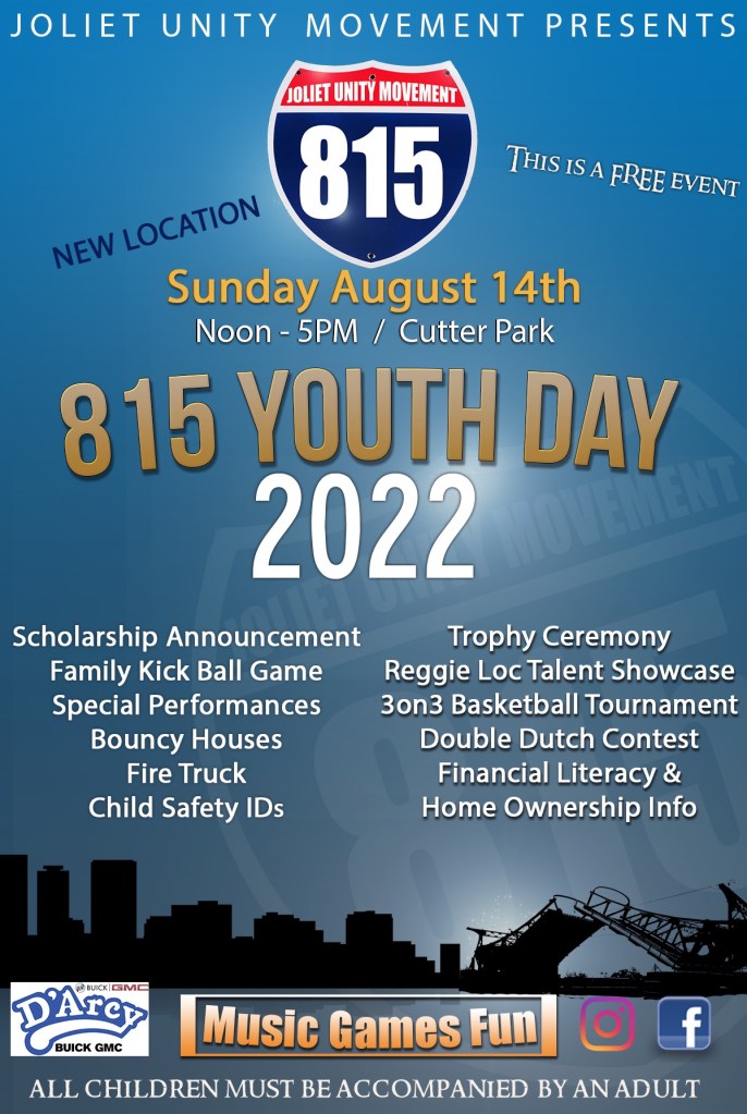 Joliet Unity Movement is proud to announce our Annual 815 Youth Day Sunday August 14th 2022. At 12pm at Cutter Park. We are at a new location this year. We invite the entire community to join us as we celebrate our youth and showcase their many talents throughout the day. As our late board member Loretta Westbrooks would urge with high energy and excitement “Bring the Kids Out to Have a Great Time with Unity 815.”